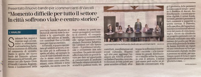 Presenti all’incontro anche il Consigliere Regionale Carlo Riva Vercellotti. Al tavolo dei relatori l’Assessore alle Attività Produttive del Comune di Vercelli Stefano Pasquino, il Vice Sindaco di Vercelli Domenico Sabatino, il Direttore di Confesercenti Vercelli Germana Fiorentino e Giada Farina dello Staff Sviluppo Economico che seguirà il bando insieme a Lea Enrico.